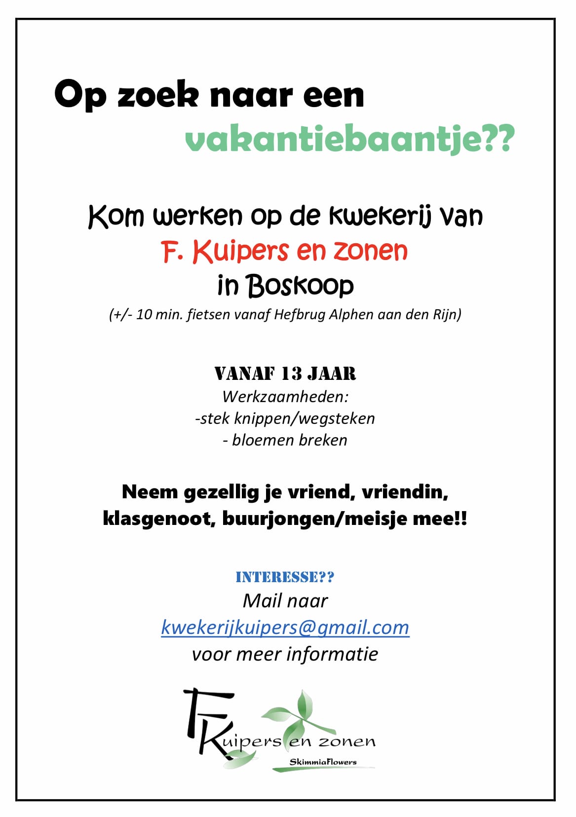 F. Kuipers en Zonen Jagerspad 4 2771 RX Boskoop Tel: 06 2027 9929 Dit e-mailadres wordt beveiligd tegen spambots. JavaScript dient ingeschakeld te zijn om het te bekijken.
